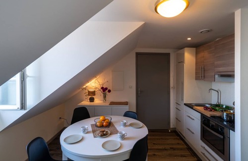 The kitchen is equipped with an oven, a stovetop, and a refrigerator, as well as a coffee maker, a microwave, and cookware. And thanks to the washer and dryer, you'll even be able to travel light. Other amenities include bed sheets, heating, and a dining table.