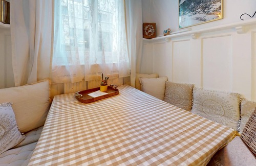 The apartment has been partially renovated and impresses with its beautiful wooden parquet flooring and a blend of modern, stylish, and rustic furniture.