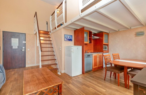 The holiday apartment Appartement face piscine et mer 4p in Le Croisic is the ideal accommodation for a relaxing holiday with a view of the Atlantic. The 44 m² property consists of a living room, a kitchen, 1 bedroom and 1 bathroom and can therefore accommodate 4 people. Additional amenities include a TV as well as a washing machine. In addition, a table tennis table and a pool table are available for your use. This accommodation does not offer: Wi-Fi, air conditioning and towels. The building in which the accommodation is located has an elevator. This vacation rental features a private terrace for relaxing evenings.