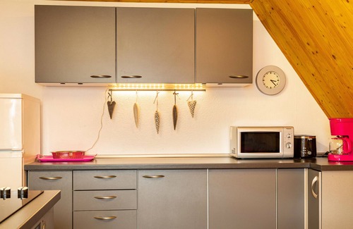 The newly renovated, cozy attic apartment has a bedroom with a double bed and a single bed. There are 2 day beds in the living room, which can also be used as sofas. Radio, TV and DVD player are installed. A spacious kitchen with corner bench invites you to linger in comfort.