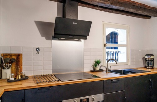 A separate kitchen, compact yet fully equipped with a large fridge/freezer, electric oven, induction hob, dishwasher, washer-dryer, Nespresso coffee machine, kettle, and toaster. Bonus: an incredible view of a medieval wooden staircase!
