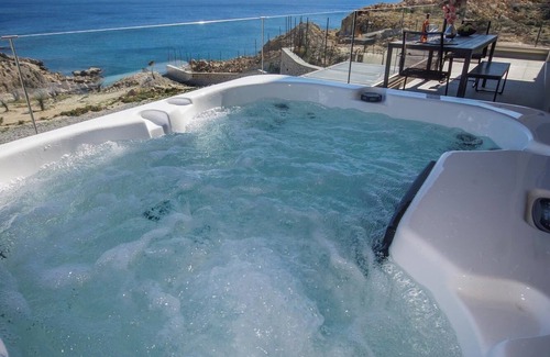 The Aquamarine Luxury apartment is a beautifully designed space that comfortably accommodates up to 5 guests. It features two bedrooms: one with a double bed and the other with two single beds. There are two bathrooms which one of them is ensuite to the baster bedroom. Both features with shower. An additional double sofa bed in the living room offers extra sleeping space. The apartment includes a fully equipped kitchen, perfect for preparing meals. Outside, guests can enjoy a private, unheated plunged pool, along with outdoor furniture to relax and take in the magnificent sea view. A charming path leads directly to the beach located right in front of the suite, offering easy access to the crystal-clear waters and the magnificent seabed.