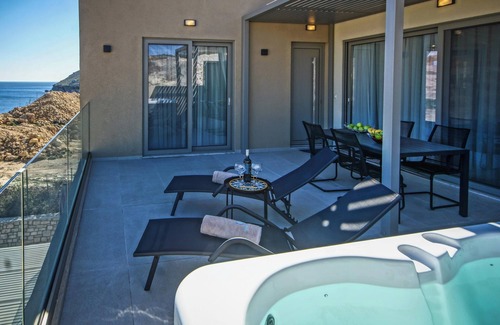 The Aquamarine Luxury Suite is a beautifully designed space that comfortably accommodates up to 3 guests. It features one bedroom with a double bed and one single sofa bed in the living room offers extra sleeping space. The suite includes a fully equipped kitchen, perfect for preparing meals. Outside, guests can enjoy a private, unheated plunged pool, along with outdoor furniture to relax and take in the magnificent sea view. A charming path leads directly to the beach located right in front of the suite, offering easy access to the crystal-clear waters and golden sands
