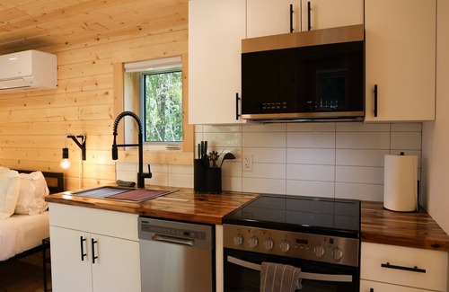 Perfect for solo travelers or couples, the lodge features an open-concept layout with warm wood accents, a fully equipped apartment-sized kitchen with stainless steel appliances, and a cozy living area. The queen bed is fitted with a Douglas mattress and premium bedding, and the spacious tiled shower adds a touch of everyday luxury.