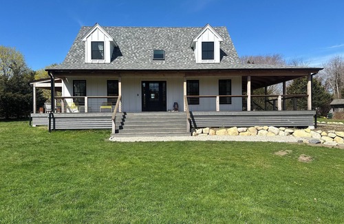 Nestled in Tiverton, an area some refer to as Rhode Island's Farm Coast, this newly remodeled 4-bedroom, 3.5-bath house offers superb accommodations for guests. All surfaces, hardware, and appliances are brand new, including an induction range. Open first-floor plan -- living room, dining area, and kitchen. Four extra-large glass sliding doors and plenty of windows open the main living space to the surrounding meadow views. Enjoy amenities like an outdoor dining table and comfortable seating on the wrap-around porch, washing machine/dryer/clothesline, compost, heating, WiFi, AC, film projector with Apple TV, karaoke!, ping pong, slackline, badminton, and other yard games on the private 1.75 acres. The house sits between Seapowet Marsh and Seekonet River. Beautiful pastoral views surrounding the property, public beach, Seapowet Bridge, and boat launch access <5 mins walk away on Seapowet Ave, trail access <5 mins to mooring, 10-minute bike ride to lovely Fogland Beach and Tiverton Four Corners, Weetamoo Woods & Pardon Gray Preserve Hiking Trails, Emilie Ruecker Wildlife Refuge, prime surf spots just a stone's throw south in Little Compton, and excellent area for family or more serious biking during your stay. Favorite local restaurants and other food options include Groundswell, Evelyn's Fish Shack, The Red Dory, Black Goose Cafe, Coastal Roasters, Gray's Ice Cream, Cheese Wheel, nearby farmstands, and Lee's Market. Stay put at home in this serene, private, coastal landscape. Or adventure to more sites and experiences in New Bedford, Newport, Jamestown, Providence, Little Compton, RI, and Westport, MA, all within a 5-40-minute driving radius. (Sleeps 9 in proper beds + space to set up available double and/or two twin air mattresses for additional sleeping.)