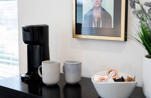 • Kitchenette with mini‑fridge, microwave, Keurig & essentials (no stove/oven or washer/dryer)