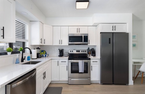 Completely updated, inside and out. Brand new 1,500 square foot PRIVATE backyard with patio, putting green, and BBQ Grill. Tastefully designed interior with fully equipped kitchen, 2 bed, 2 bath, 2 parking spaces. Large flat screen smart TV and WiFi. Very close to the beach and around the corner from tons of restaurants, shopping, and entertainment (Target and Publix are a short walk). Beach is 1.3 miles away. Complimentary use of beach chairs and umbrella (please request in advance).
