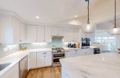 Tucked away on a quiet cul-de-sac, this private retreat offers peace, privacy, and the gentle soundtrack of passing boats and birds overhead. Inside, you’ll find three levels of open living space with seven bedrooms and a gorgeous great room flooded with natural light. The living area features plush seating, a large flat-screen TV, and flows seamlessly into the dining space, kitchen, and cozy lounge. Unique art and thoughtful décor add charm throughout.