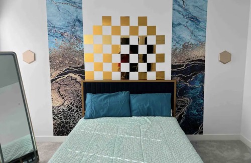 A very unique house that derives from the stem of the Azure blue color, featuring a blossom Lotus flower wall, along with a Azure skies cloud ceiling wall with blends of wallpaper murals that will calm you as soon as you enter Relax with the whole family at this peaceful home in a truly unique experience perfect for traveling families, and or travel nurses extended stays welcome featuring a lovely flower wall!
