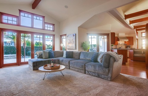 The main living area features a large sectional and TV, and French doors open to the main outdoor space with lounges and a hot tub. The adjacent kitchen features rich solid hardwood cabinetry, a breakfast bar for 4, and is equipped with chef’s grade stainless steel appliances. There’s a light-filled breakfast nook with a table for 4 and an elevated dining room that seats 8.