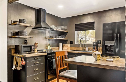 Framed by gorgeous vaulted ceilings and windows, the living room is the perfect spot to spend leisure time. Guests will love the large sectional couch, wood burning fireplace, smart tv, and huge selection of board games. The fully equipped kitchen may be one of the most beautiful rooms in the house with its modern design and chic appliances. Also incredibly functional, the kitchen has all the cookware and tools you’ll need for convenient cooking at home. Enjoy causal bites at the kitchen island with barstool seating, while formal meals can be hosted at the dining table set for 4.
