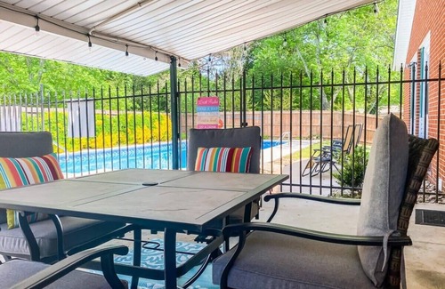 Relax comfortably in this cozy 4 bedroom 2 bath oasis with a pool that sleeps 10, with an extra sleeping area in the den. Close to Huntsville Botanical Gardens, Dublin Park, and Rainbow Mountain Trails. The home sits on a large corner lot with secluded cul-de-sac! You will enjoy both the outside and inside of this home with a covered patio seating area and a private backyard which boasts beautiful wrought iron fence with seasonal pool. Free wifi, pet friendly with fee.