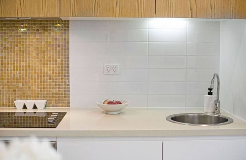 Inside is stylish with its modern plush couch, vogue armchair, glass coffee table and wide-screen smart TV, while offering a setting for 4 on the glass dining table, and an office desk with power points underneath. The kitchen wraps around the edge of the living space, featuring a gold metallic mosaic splashback, stainless steel appliances, integrated Fisher and Paykel dish drawer, a fridge, an espresso machine and is stocked up with herbs, condiments, oils and vinegar so you only need to buy your essentials.