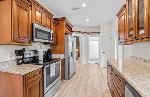 Step inside and you’re greeted by a beautiful entryway filled with natural light and a—the perfect spot to settle in after a day of exploring. The living room invites you to unwind on the comfortable couch while enjoying your favorite shows on the smart TV, with a dining table for four tucked neatly behind, seamlessly flowing into the kitchen. Here you’ll find warm, modern finishes, stone countertops, and a spacious layout equipped with everything you need, including a Keurig for your morning coffee ritual. For those who need to mix work with play, a semi-private office space with a desk and abundant natural light makes productivity easy.