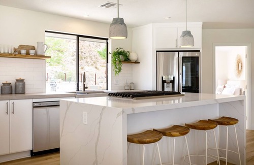 Its sleek interior is detailed with modern décor and elegant furnishings, exuding a welcoming yet sophisticated atmosphere. Wood accents complement the neutral-tone color palette. Take a seat in front of the living room with a bottle of wine and good company. Soaring windows look out to the mountains and birds-eye view of the entire valley, expanding the living space, and brining in natural light throughout. Additional perks include an open-concept great room, smart TVs in all guest suites, high-speed wifi and ample dining options for large groups. The brand-new kitchen has waterfall island seating, stainless steel appliances and is fully stocked with all the essentials to entertain family and friends.