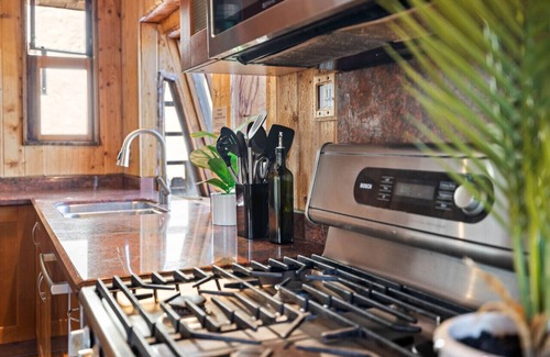 The kitchen is fully stocked with all the basics to bring your gourmet ideas to life! Enjoy stainless steel appliances, a gas range, a microwave, a full fridge, coffee maker, and all the cookware and utensils you need. Beautiful wood cabinetry and warm cabin details add to the inviting atmosphere, making it a joy to cook and connect with loved ones.