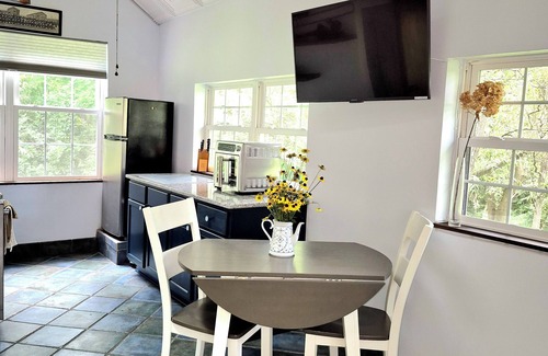 Bloomington is waiting for you at this 1-bedroom villa. The serene atmosphere of this welcoming property located on 4+ acres adjacent to our main house, will make guests feel like welcomed guests. 2 queen beds, one is sleep number queen bed, WiFi, heated bathroom floors, kitchen with cooktop, dishwasher and large toaster oven all dishes, pots and pans provided. Unique spiral staircase, tile floors, and guest amenities for relaxation, including a lovely tea and coffee selection and personal spa items provided. Guests can relax and unwind in this excellent retreat, only 9 miles form IU. Experience what Bloomington has to offer with a stay at our villa.