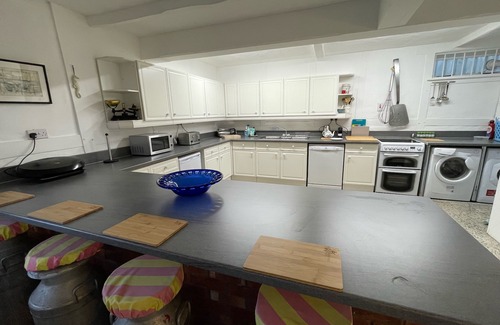 As you enter the house there is a wide and generous hallway with copious hanging space for coats and beach stuff, plus shoe storage. The hall has a terrazzo floor that continues into a huge dual aspect kitchen and dining room. The kitchen is large with lots of cupboards and workspace and is well equipped. .The dining area seats 8 comfortably and has a great view looking out to the beach. A great spot to have a coffee and watch all the coming and going of seaside life. This is our favourite room in the house and there are many great memories from sitting around this table.
