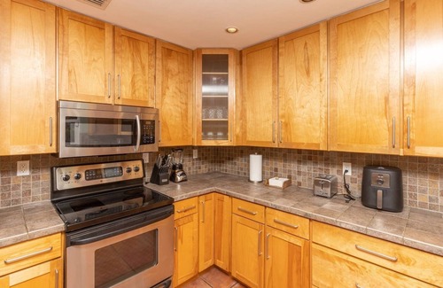 The kitchen is fully stocked with all the essentials: air fryer, blender, pots, pans, utensils, coffee maker, oven, microwave, and dishwasher.