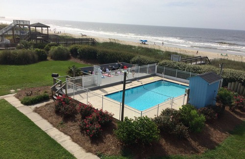 Enjoy the beautiful Atlantic ocean from this 3 bedroom 2 bath condo that is located ocean front on the upper level at Ocean Isle Beach, NC. The deck overlooks the pool and offers great views of the ocean and the pier. Pool opens April 1; closes October 31. Amenities include Wifi, large flatscreenTVs in living room and in each of 3 bedrooms, outside shower, coffee maker, W/D, DW. Beds: 1K, 1Q, 2S, 1DS/S. Guaranteed parking is limited to one space. Park in the space labeled for C3. Unit is located on the second floor of the third building (C) in the 3 building complex.