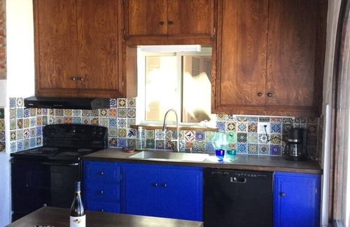 You enter the home from a large patio overlooking the beach with with views of the ocean and the Coronado Islands in the distance. Depending on the tide, the ocean can be literally a stone’s throw away. The front of the house has a great room with a full kitchen/dining area and extensive ocean views. There are 3 bedrooms and two large bathrooms with beds for 12, including two bedrooms with lofts and queen beds. The master suite “Los Padres” has a queen bed, attached bathroom and a partial ocean view. “Elena’s ” room sleeps four with a queen bed and a loft with a queen bed. The third room bedroom, “El Apartamento” sleeps up to 6 with two queen beds, and a loft with a queen bed. It has an attached bathroom with a large walk in shower and rinse off bench with a second shower valve. Our baths and kitchen feature custom tile work, and we have custom woodwork and furnishings made by local craftpersons throughout.