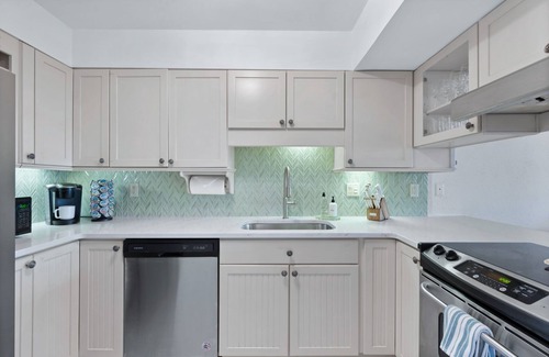 The 2-story condo overlooks the pool and courtyard with ocean views of the pristine Atlantic Ocean from the living room and balcony. The kitchen is fully stocked with a variety of dining ware and cooking items for use both indoors or poolside (plastic, non-breakable). The living/dining room is the perfect spot for entertaining or winding down, featuring a 42-inch smart TV with streaming channels built in, Nest thermostat, and portable bluetooth speaker to play your favorite music. One full bathroom with walk-in shower is conveniently located on the main level.