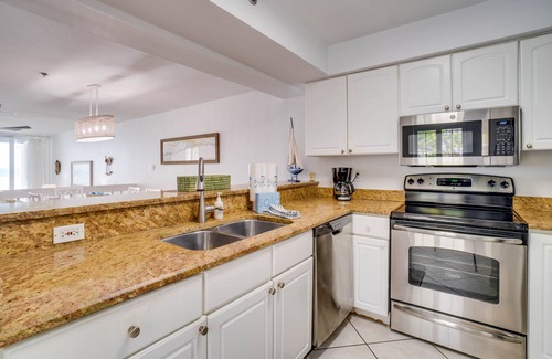 Very few beachfront vacation homes will get you as close to the sand as Hidden Cove #1— a beautiful 2-bedroom condominium with exquisite views and unlimited access to the aquamarine Gulf of Mexico. Located within a charming coastal community that also offers a crystal-clear swimming pool, your family will quickly fall in love with this gorgeous oasis and flawless central location. For an absolutely unforgettable getaway to the Gulf— pack your bags and book a stay at Hidden Cove #1. In the sunken, main living area, the floor plan is open and inviting, boasting ocean views from nearly every seat. A plush sofa and armchairs sit on the cool ceramic tile floors and face the large HDTV— perfect for a family movie night with a big bowl of popcorn. There's even a small desk area for getting a little work done— if you must.