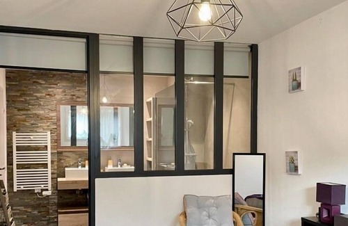 Bedroom and bathroom connected by a glass door, possibility of separation with blind.