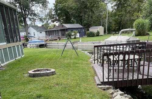 Relax with the whole family at this beautiful peaceful place to stay. Completely remodeled top to bottom. The house is very spacious with a beautiful three season room overlooking the water. The master bedroom has a queen, guest room has a full over full bunk bed as well as a twin over twin bunk bed. A large back deck with built-in bar also a deck over the water! You have a boat dock readily available on the property. 20 minutes from shipshewana and a quick 30 minute drive to Pokagon State Park.