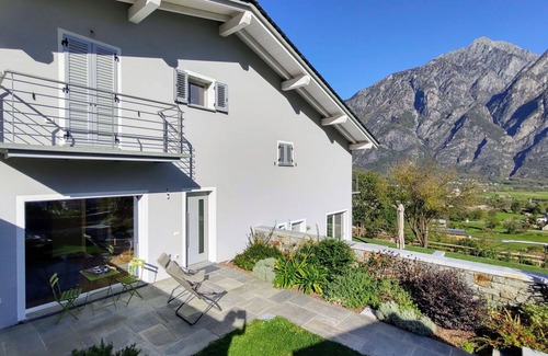 Nestled in the district of San Pietro, 9 km from the center of Novate Mezzola and 14 km from Chiavenna, this modern 2-family house "Ronscione Bellavista" offers a tranquil, sun-soaked vacation rental in a countryside setting. The property boasts a spacious, well-manicured terraced garden spanning 7,000 m2, complete with a lush lawn and shady trees for your enjoyment. Additionally, you have access to a private garden of 60 m2. Enjoy the convenience of on-site parking and ample storage space, including a room for bicycles and a storeroom. The property offers amenities like a yard, internet WiFi, and parking, ensuring a comfortable stay.