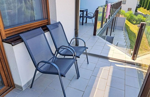 The open kitchen is well-equipped with an oven, dishwasher, 4 ceramic glass hob hotplates, a toaster, kettle, and an electric coffee machine. The property also features a bathroom and a separate toilet. The floors are made of natural stone, adding to the luxurious feel. The large balcony offers a beautiful panoramic view and comes furnished with balcony furniture and a box-room. Other amenities include a washing machine, free WiFi internet access, and reserved parking for two cars.