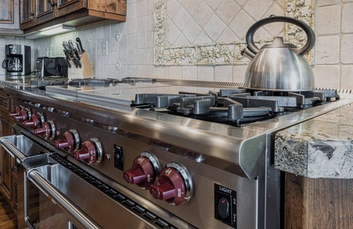 The fully equipped chef's kitchen has stainless steel Wolf appliances, a subzero refrigerator, double ovens, and a wet bar, creating the perfect cooking, dining, and entertaining experience. Seating is available at the kitchen counter via bar stools.