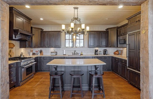 KITCHEN & DINING The fully stocked kitchen will impress professionals and avid enthusiasts with its copper sink, solid surface countertops, and stainless appliances that include a commercial-grade gas stove and a wine fridge. You will have everything needed to put delicious meals on the table, and sous chefs will appreciate the large center island. Open to the kitchen, the dining area affords mountain views and houses a table for eight; three more can be seated at the kitchen island.