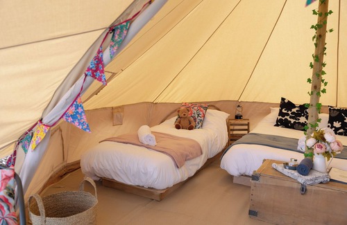 Our lovely family 5m bell tent can accommodate 1-4 people either as 1 king size and 2 x single beds or 4 x single beds. All with pocket sprung mattresses and high quality crisp cotton bed linen and towels. A fire pit is provided for cooking and warming yourselves while enjoying the sunset. An outdoor kitchen with gas rings is provided. A selection of outdoor games onsite for family entertainment so you can leave the tech for a day or two and escape. Great for a friends getaway too. Lots of walks, pubs, restaurants and countryside to explore. You can bring your bikes too!