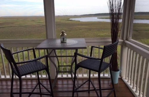 The primary bedroom has a king bed and full ensuite bath. The private deck offers a quiet place to take in the island wildlife and the sights and sounds of the salt marsh.