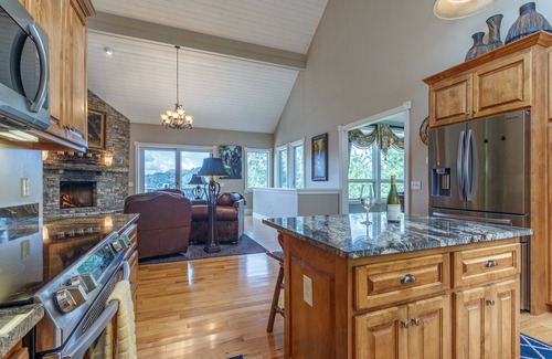 When you walk into the home, stepping foot into the living area you'll notice the breathtaking view of Lake Glenville and the mountains, lush with vibrant colors during the spring, summer, and fall, and snow-topped during the winter months. The open floor plan connecting the living area, kitchen, and dining room and a skylight above the kitchen island boasts natural light. Of course, no mountain retreat would be complete without a large remote controlled stacked-stone fireplace to take the chill off of cooler nights or curl up on the nap-worthy leather furniture with a good book and cozy blanket.