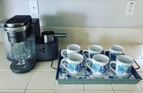 The kitchen - open concept kitchen/dinning area with modern finishes. Includes a Cappuccino/Latte Keurig Coffee maker with complementary coffee, tea and decaf. Complementary snacks included.