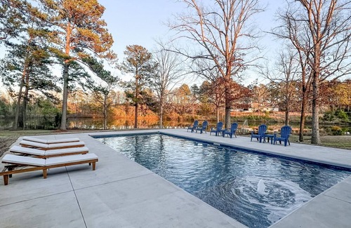 New home on 3.5 acres with a beautiful view of the water, double ovens with built-in air fryer and convection oven, large pantry, new washer & dryer with plenty of folding space, wood throughout house, quartz countertops, 3 fireplaces, two living spaces with large TV's, 3 large covered porches, pool with tanning ledge, roomy 3 car garage, a stocked pond for fishing, golf cart for use, modern decor. Perfect for a large group!