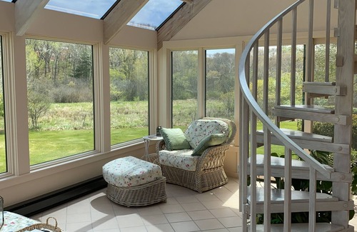 Off the living room there is a four-season sunroom attached to the house that consists mostly of windows facing East and South. It is perfect in the fall, winter, and spring for breakfast, working, reading, watching the snow, the birds in the bird-feeder, the sunrise.
