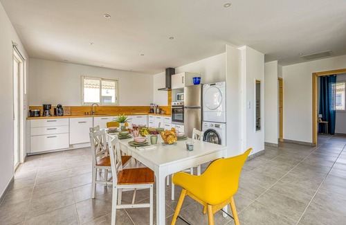 You will be staying in a 4-room house that measures 107 square meters. The house is suitable for accommodating 4 adults and 4 children comfortably. The living/dining room is equipped with a TV (flat screen) and has an exit leading to the terrace and swimming pool. There is one room with two sets of bunk beds (90 cm wide, 190 cm long), and two separate rooms, each with a French bed (180 cm wide, 200 cm long).