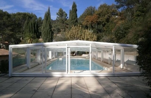 This high standard house has Carrara marble floors, a large living/dining room, an equipped kitchen, 3 bedrooms, 2 bathrooms, space for 6 people, barbecue, a large indoor pool of 10x5 m, an outdoor pool with built in Jacuzzi, and a land of 1800 sq.m on private hill in the heights of Draguignan. You will find the beaches of Saint Aygulf, Frejus, Ramatuelle, and Saint Tropez 25 min away by car. Haut-Var. Everything is close (Gorge du Verdon).