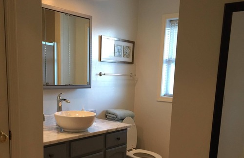 The Tryon View Chalet offers 2 stories in the main home with breathtaking views of the Blue Ridge Mountains. The living room is dramatically vaulted 2 stories high. This updated home sleeps 5 with 2 large bedrooms and a loft, plus 2 full baths and laundry room/mud room. ( Loft has a single bed and office desk setup) The kitchen offers new shadow storm granite counter tops, a gas stove, dishwasher, refrigerator, new stainless steel sinks and everything a chef needs to prepare the perfect meal. Beautiful new grey roan hardwood floors run throughout the home. The back deck sweeps 30 feet across the back of the home and offers the perfect spot to sip a glass of wine or enjoy your morning coffee.
