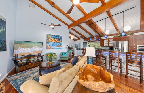 Upstairs offers a large modern kitchen with new stainless steel appliances, spacious living room with comfortable memory foam sofa bed, HD Flatscreen TV, Full Bath with Shower, Dining Room, and a large Lanai with picturesque views while dining in the breezes of South Maui.