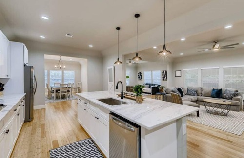 Beautifully remodeled 4-bedroom 3 full bath home in the heart of San Antonio. One story open floor plan allows the whole group to relax in comfort. Dining for 8 as well as a large island bar. Master offers a workspace.