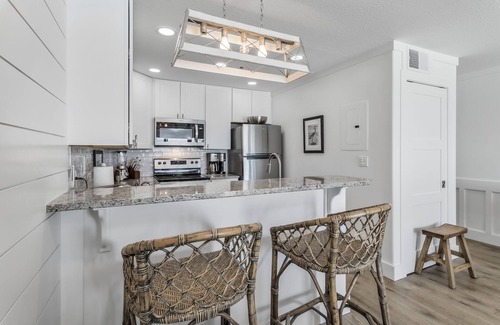 This 794 sq ft condominium offers a large living area with beautiful high end sofa and swivel, rocking chairs and a 65" smart TV. The spacious private balcony is the perfect place to spot dolphin or look at the stars. It has a dining table for four and a breakfast bar. The kitchen is fully equipped for all you foodies, with granite countertops, all new stainless steel appliances, dishes, stemware, silverware, cookware, bakeware and more. With a full size blender, both Keurig and drip coffee maker you will be ready to make your favorite beverages.