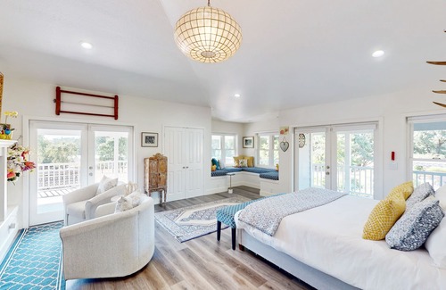 Providing a private haven for you and your loved one, the primary suite is warmed by a gas fireplace and offers a work desk, balcony access, and a spa-like en suite bathroom. Indulge in yourself when you sink into bubbles in the soaking tub or rinse off under a warm stream of water in the walk-in shower. The home's additional bedrooms are just as inviting, all with cheerful color palettes, plush linens, and personal TVs. A private washer/dryer, central air-conditioning, and internet access tie together the perfect list of interior amenities.