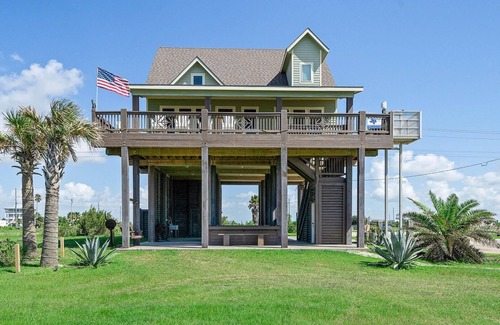 Bella Vista is a beautiful coastal inspired beach home that offers amazing sunsets and spectacular views of the beach, Gulf of Mexico, and East Galveston Bay all from the furnished wrap-around deck. The house has 4 bedrooms and 2.5 baths, and is located on the quiet end of the Bolivar Peninsula, while still being just a short drive to shopping and restaurants.