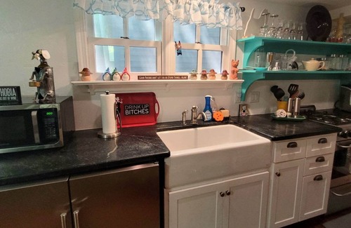 KITCHEN – Eat-in kitchen with white farmhouse sink, brand new countertops, slim stove/oven, and microwave. Fully-stocked with Keurig coffee machine, dish sets, silverware, pots and pans, cups, wine glasses, mugs, pitchers, pantry items – everything needed to prepare meals at the cottage. A modern, stainless steel mini refrigerator and freezer, as well as an additional mini refrigerator provide ample space for your grocery items. The expandable dining table has room for everyone to sit together. Access to finished basement, back patio, and front porch.