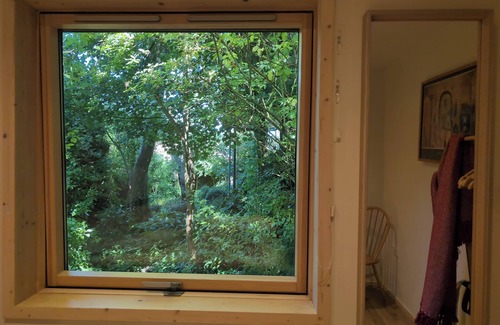 The cosy Cabin is set in a secluded corner of our woodland garden, next to our home, the Treehouse as seen on Grand Designs 2023.