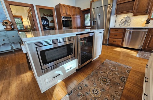 Upon entering the drive to our hidden getaway, you are greeted with a mid-century modern facade with lots of vegetation. Inside the home you'll be greeted with 20-foot-tall ceilings clad with Juniper wood. The wall of windows gives you a glorious view of the live oak trees, dolphins feeding in the Bay, and pelicans flying above. The house is decorated in a laid-back coastal feel that doesn't feel too stuffy, just right. Our open living area sits several comfortably with a view of the TV, fireplace and that Bay view! It also has a game table for late night gatherings, with supplied card and board games. We also have high speed cable internet as well. The kitchen has an eat at island and dining set for plenty of gatherings. Our cabinets are filled with everything you will need for cooking meals and entertaining. We have an induction cooktop, 42" refrigerator, dishwasher, double ovens, microwave and beverage fridge (see link below for detailed cabinet pictures). In the huge laundry room off of the living area, there is plenty of space to sort and fold clothes and an appliance pantry full of small appliances. This entire area is all open for cooking, eating, gaming, watching TV and the pelicans & bald eagles soaring in that beautiful view!